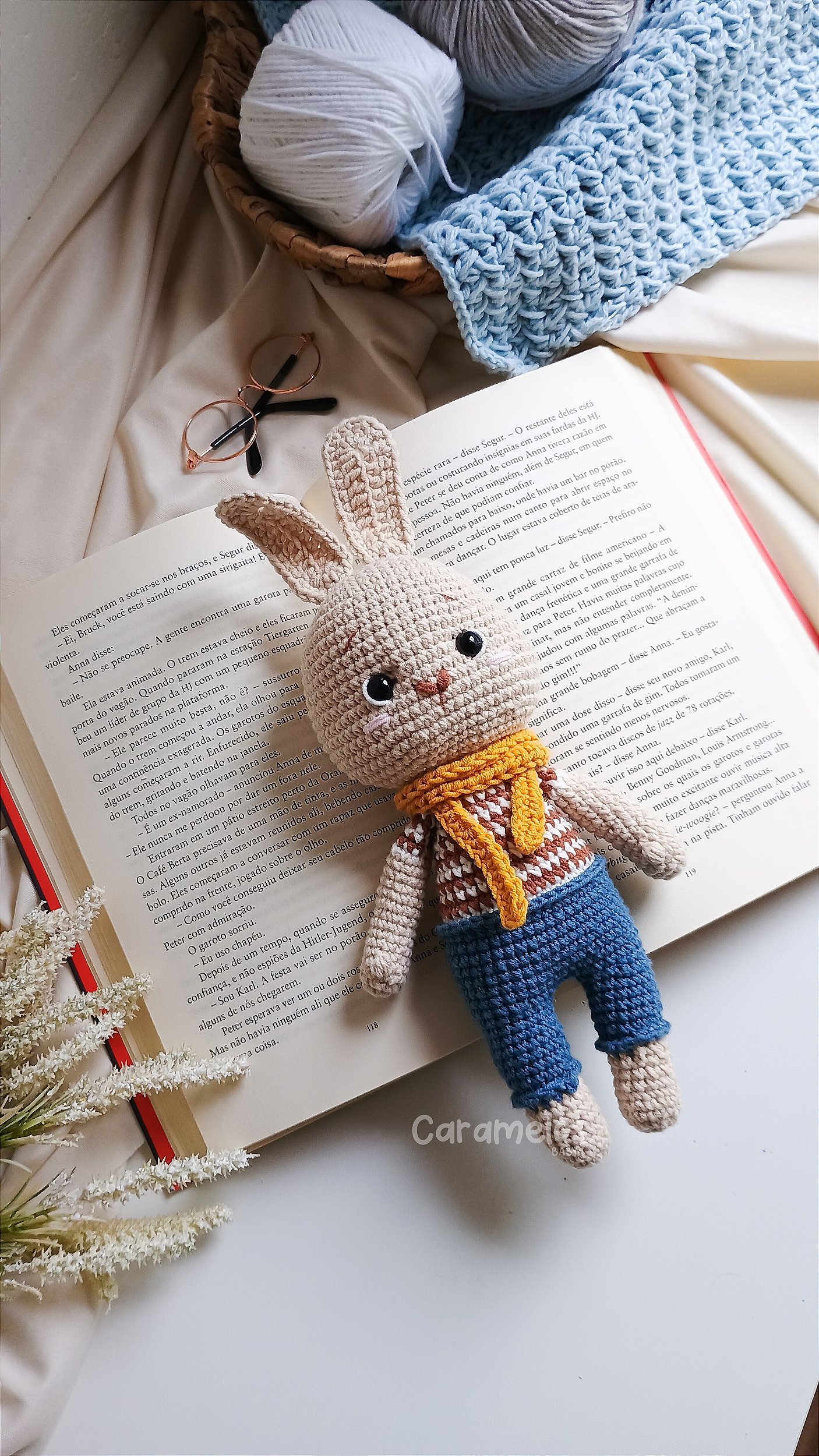 Nosso Coelhinho Amigurumi é produzido artesanalmente, ponto a ponto, com muito carinho e atenção aos detalhes. A roupinha — calça azul e camiseta listradinha em branco e marrom — traz um charme especial, deixando a peça delicada e perfeita para presentear ou decorar ambientes infantis.